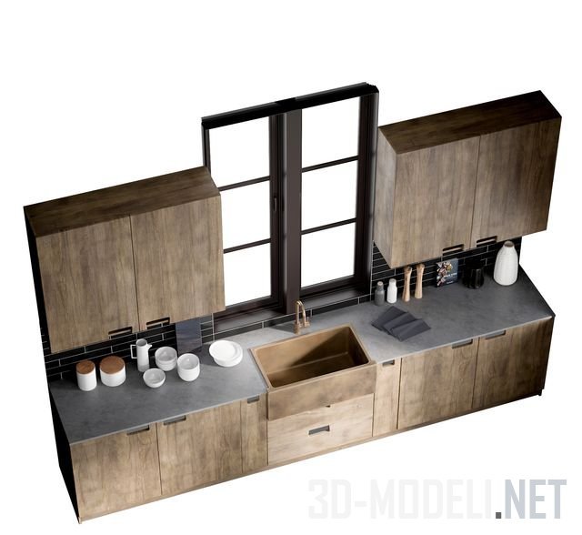 Деревянная кухня коричневого цвета с расположенной под окном столешницей, в которую вмонтирована мойка, точно посередине окна. Справа и слева от коричневой оконной рамы, разделенной двумя узкими горизонтальными планками по створкам, висят закрытые кухонные полки такого же цвета как и нижние. На столешнице находится несколько кухонных аксессуаров, разделочная доска, белые миски и прочее.