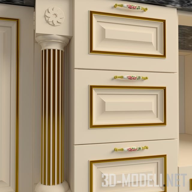 Большая красивая итальянская кухня светло-бежевого цвета, декорированная золотой фурнитурой и коричневыми узкими рамками.