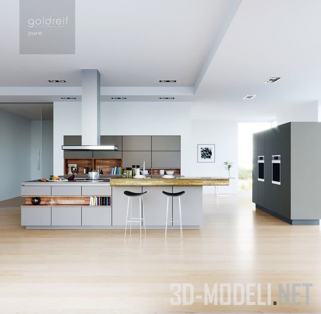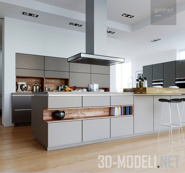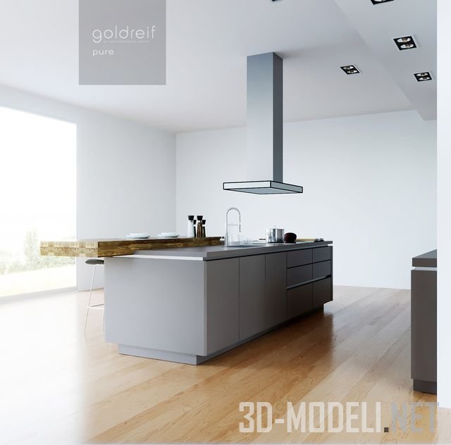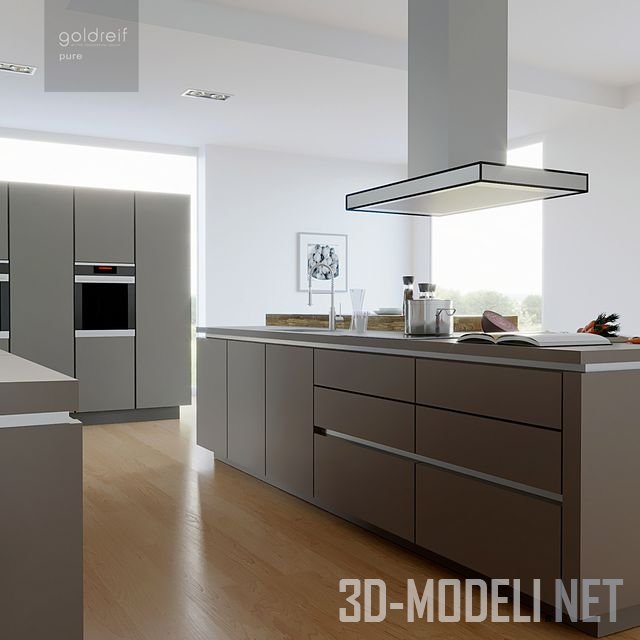 Кухню Goldreif Poggenpohl из серии Pure отличает роскошный минималистский стиль, что обеспечивают чистые, незагроможденные линии мебели. Фрезерованная выемка на фасадах позволяет легко открывать двери и ящики. В наборе полки с посудой, овощи, кухонная техника, светильники и декор. 3d модель создана качественно.