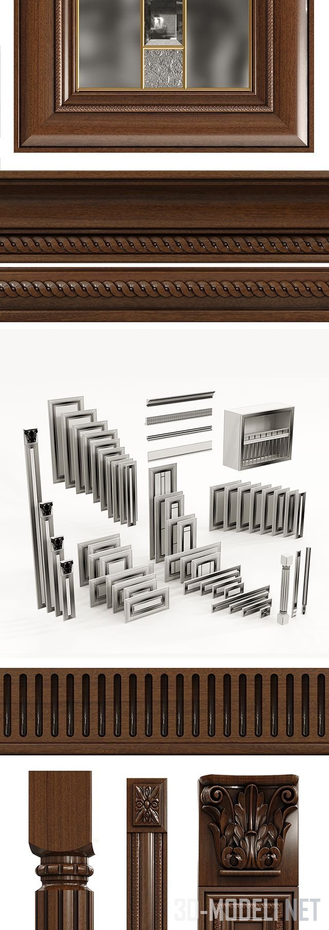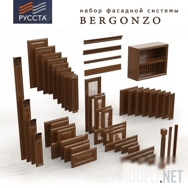 Комплект фасадной системы фирмы Russta. Серия Bergonso. В наборе фасады, карниз верхний, лепнина прямая, нижняя прямая, плинтус прямой, пилястры, чаша, колонна, лепнина декоративная + капители, колонна-постамент колонна, угловая колонна, внутренний угол для цоколя.