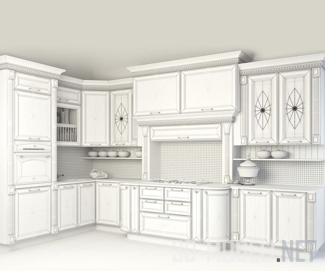Классическая угловая кухня KUCHENBERG Camilla, каркас которой сделан из массива ольхи. Фасады кухни выполнены из МДФ Glunz Sonae, облицованного шпоном вишни. Белая столешница и коричневые глянцевые горшочки на полках придают кухне уютный вид. Для формирования кухни использована следующая техника: