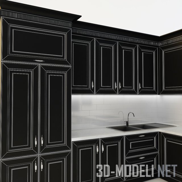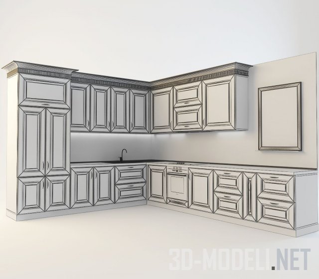 Выполненная в классическом стиле угловая кухня (габаритные размеры 3200 х 3900). В файле нет оборудования, раковины и смесителя, зато присутствует чудесная меловая доска, на которой можно записывать и вкусные рецепты, и планы на будущее.