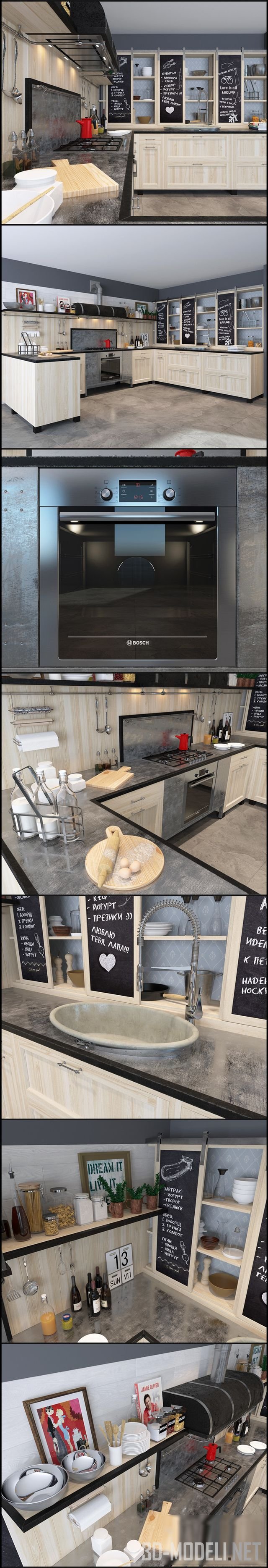 Современная минималистичная кухня Panamera от Marchi Cucine, с элементами стиля лофт. Простые фасады из светлого дерева с прямыми рамками, скомбинированы с черными матовыми досками для леттеринга и скетчей белым мелом. Центром композиции выступает духовка BOSCH HBA 23 R 150 R и варочная панель Smeg PX175L. Столешница, элемент кухонного фартука возле варочной панели и вставка возле духовки выполнены из металла с нанесенными царапинами и окантованы черным матовым профилем. Смеситель HANSGROHE Cento XXL и овальная раковина обеспечат удобное пользование водой. В сцене множество посуды b аксессуаров.