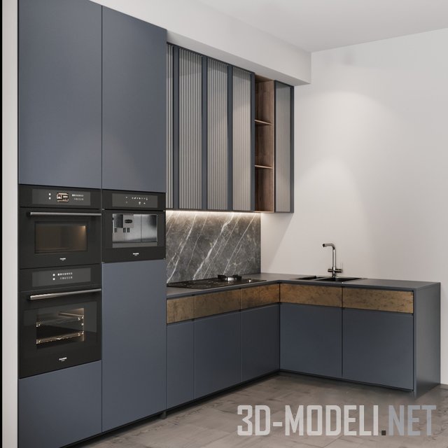 Современный кухонный гарнитур с угловой рабочей поверхностью и встроенной техникой. Встроены: микроволновка Fulgor Milano FCMO 4507 TM BK; кофемашина Fulgor Milano FCM 4509 TC BK; духовой шкаф Fulgor Milano FCO 4512 TM BK; варочная панель Fulgor Milano FCH 905 ID TS G DWK BK. Техника с черной отделкой отлично сочетается с фасадами графитового цвета с легкой синевой. Фасады выдвижных ящиков, размещенных под рабочей поверхностью - охристого цвета. Отделка фартука - темно-серый с белыми прожилками мрамор. Мойка Fulgor Milano P2B 5343 Q U и смеситель AQUASanita хром 2663-001 смонтированы на графитовой столешнице. Изюминкой подвесных секций являются стеклянные вставки с вертикальной гофрой. Подсветки рабочей поверхности и внутри подвесных секций - светодиодные. Габарит данного блока:330+183см x 270см x 60см.