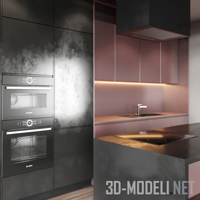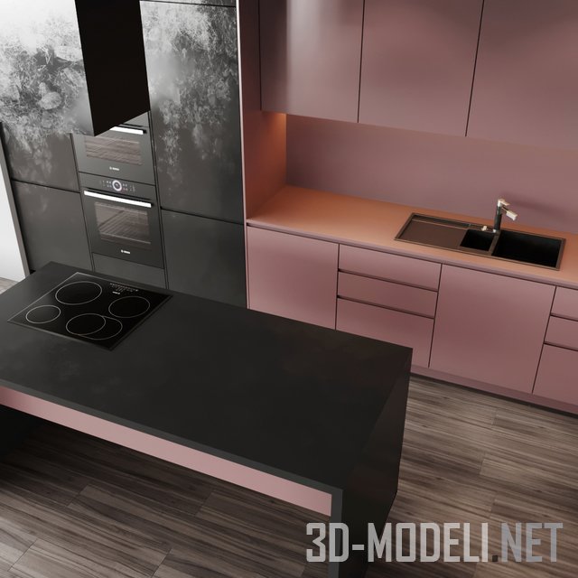 Современная черно-розовая кухня с островной секцией и встроенной техникой. Габариты гарнитура без островной секции: 427,5х267,5х627см. Габарит «острова»: 200х86х90см. Варочная поверхность встроена в черную столешницу острова. Вытяжка в черном коробе размещена над варочной поверхностью. Фасады прямые, без ручек. Под навесными секциями смонтирована лента с подсветкой.