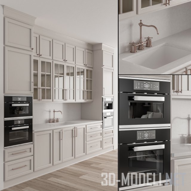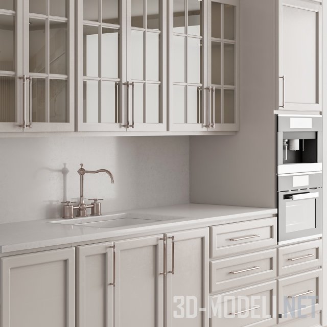 Элегантная мебель для кухни, оформленной в неоклассическом стиле. Фасады кухни имеют приятный кремовый цвет. Кухня дополнена встроенной техникой.