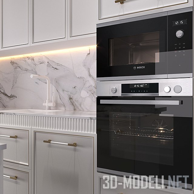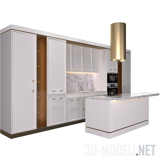 Современная белая кухня с элементами стиля «неоклассика», с островной секцией, овальной потолочной вытяжкой золотистого цвета и встраиваемой кухонной техникой Bosch Serie 6 (повышенной комфортности). Боковые плоскости острова и вставки на основном блоке выполнены в виде декоративной 3D панели с вертикальным гофрированием. Столешницы и фартук отделаны под белый с серыми прожилками мрамор. Смеситель - белый. Верхние шкафы имеют снизу подсветку рабочей поверхности. Габарит кухни: 4,8х2,3х0,6м.