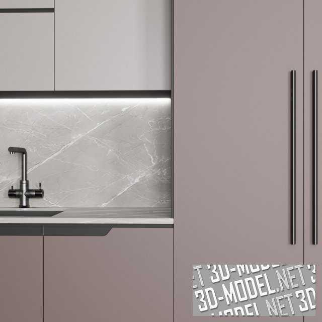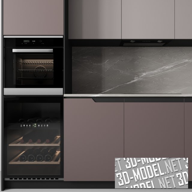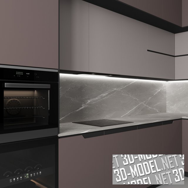 Угловая кухня в стиле минимализм, с фасадами цвета какао и какао с молоком, со встраиваемой техникой (духовка, варочная поверхность, небольшой винный шкаф) черного цвета и фартуком с текстурой серого мрамора с белыми прожилками. Цоколь, лаконичные ручки на нижних створках и корпуса кухни изготовлены в черном цвете, что отлично гармонирует с цветами фасадов. Габарит блока: 364х298,5х294,5см.