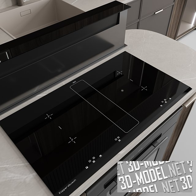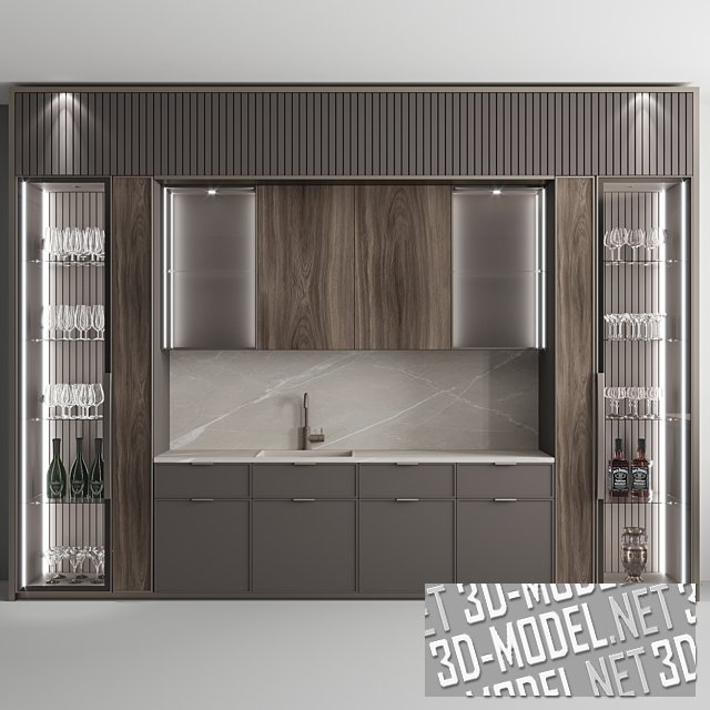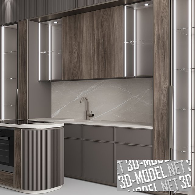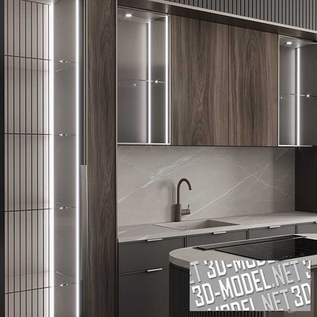 Элегантная кухонная мебель, с отделкой в темном цвете. Кухня с островной секцией и техникой, но светильники и предметы посуды отсутствуют. Размеры кухни: высота 3150 мм длина 4225 мм. Архив содержит два варианта островной вытяжки, открытый и закрытый.