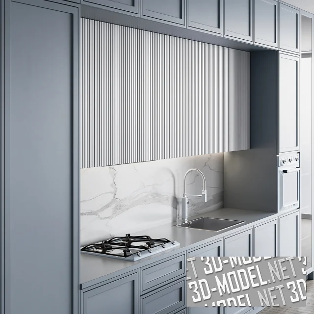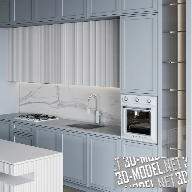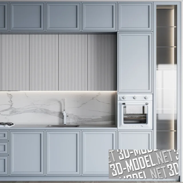 Комплект кухонной мебели для современного пространства. Форма кухни линейная, дополнена островной секцией. Фасады и элементы отделки выбраны в серо-голубых оттенках, что смотрится очень эстетично.