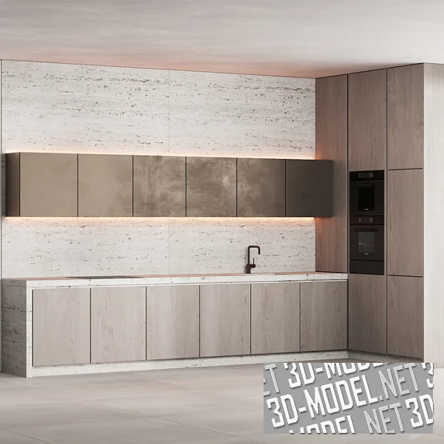 Современно оборудованная кухня с мебельной группой и техникой. Использованы следующие материалы: мрамор, травертин, латунь и дерево. Шкафы, смеситель, мойка, встроенная вытяжка, индукционная плита, духовка и микроволновка отлично вписываются в кухонное пространство и составляют единую гармоничную композицию. Размеры: В 300 см, Ш 426 см, Г 190 см.