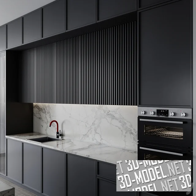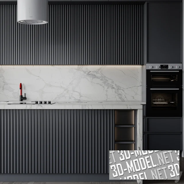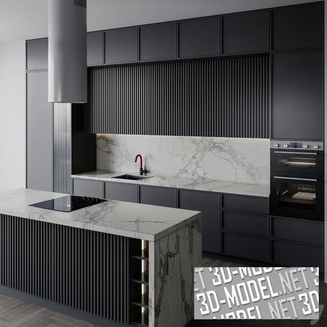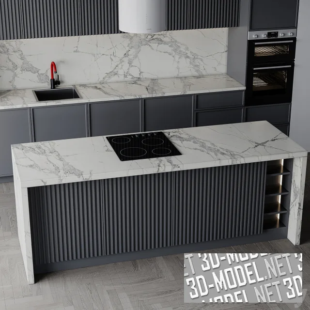 Современная минималистичная кухня с островной секцией. Элементы мебели скомбинированы из графитово-серых плит (корпуса, гладкие рамочные и вертикально-реечные фасады) и белого с серыми прожилками мрамора (столешница и боковые опоры острова, основная рабочая поверхность и фартук над ней). Створка узкого пенала в основном блоке выполнена из гофрированного стекла, отлично сочетающегося с основными материалами отделки кухни.