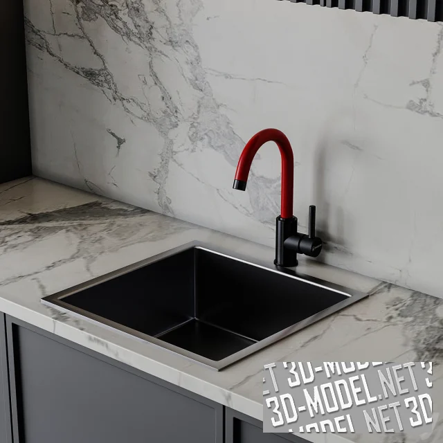 Монохромная кухня в стиле минимализм, с красным смесителем