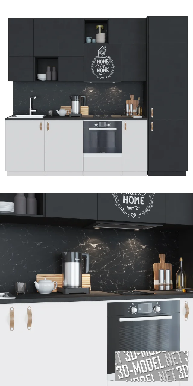Современный компактный кухонный блок от IKEA. Кухня изготовлена из плит черного (навесные секции и шкаф с встроенным холодильником справа) и белого (нижние секции) цветов. Фартук и столешница - черные со светлыми прожилками. Один из черных фасадов в навесных секциях декорирован белым графическим рисунком с надписью: «Home Sweet Home». В столешницу врезана электрическая варочная панель на две конфорки и встроен духовой шкаф снизу. В левую часть столешницы врезана прямоугольная мойка с серебристым смесителем. На столешнице и открытых полках посуда, разделочные доски, растительное масло в стеклянной бутылке, современный электрочайник, вазы, книга, солонка и перечница.