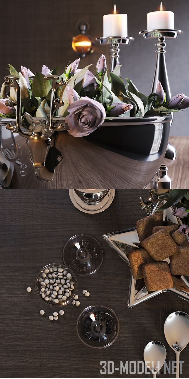 Очень изысканный сет в серебристых тонах. Мельхиоровые подсвечники со свечами, большая серебряная ваза, наполненная бутонами белых роз, тарелка с серо-серебристой салфеткой, вазочка с печеньем и мельхиоровые столовые приборы.