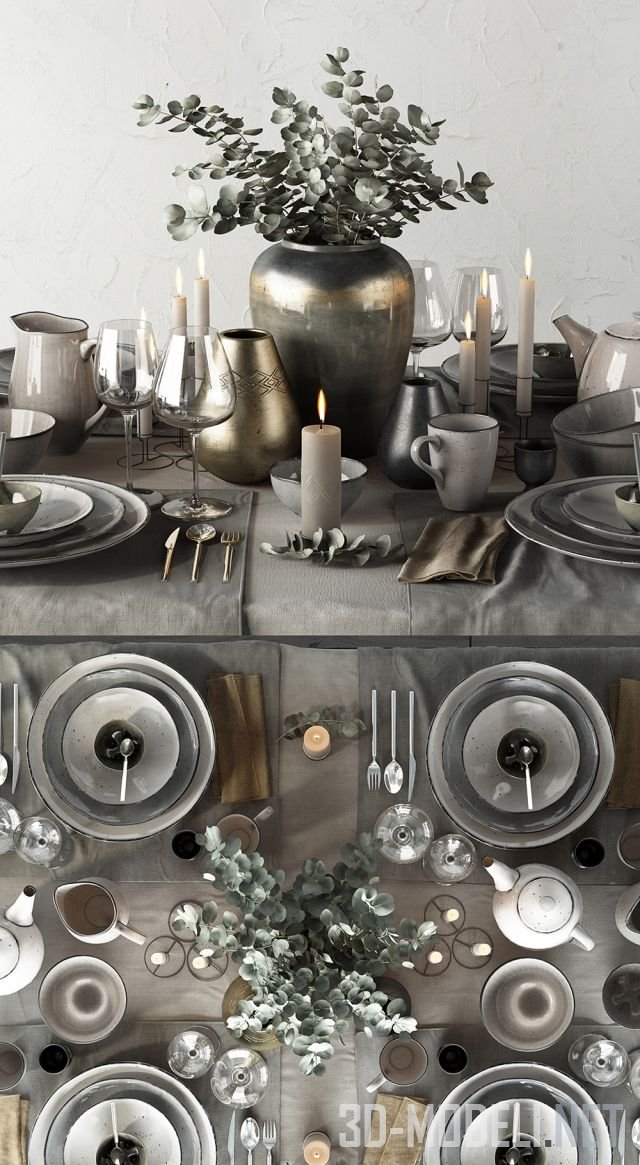 Сервировка стола, элегантный и одновременно брутальный стиль которой идеально впишется в скандинавский интерьер. В комплекте стол со скатертью, салфетками и различными предметами посуды (тарелка, чашка, кувшин, чайник, стакан, бокал, рюмка, вилка, ложка, нож). Ваза и свечи придают композиции законченность и вносят уютную нотку.
