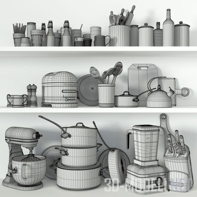 Большой комплект для декор кухни в этно-стиле, набор разоичной медной посуды (кастрюля, сковорода, банки, емкости и пр.) и техники (блендер, миксер). Реалистичная, высокого качества 3d модель с текстурами.
