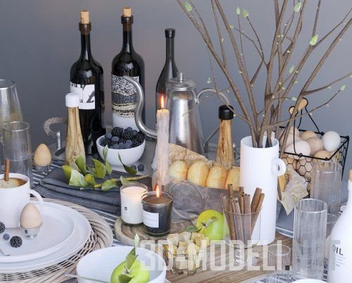 Сервировка стола для романтичного пикника на даче. В комплекте следующие предметы: белая и прозрачная посуда, три бутылки на серебряном подносе, ваза с распускающимися ветками, свечи, яблоки, корица в стаканчике, металлический чайник, пончики, ежевика и голубика в миске, кубики сахара, солонка и перечница из дерева, бутылочка с маслом, корзина с куриными яйцами. Натюрморт оставляет ощущение свежего воздуха и легкого ветерка.