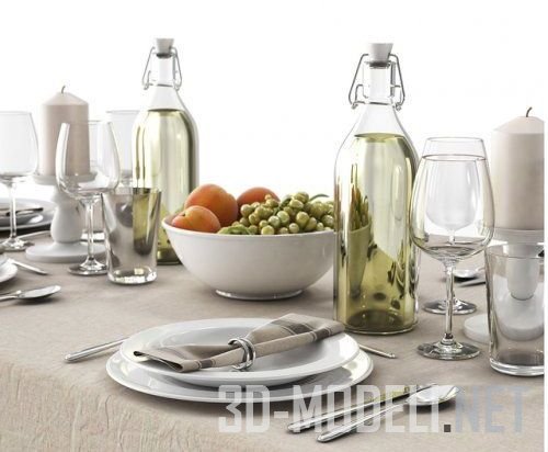 Сервировка на шесть человек и аксессуары от бренда IKEA – Vardagen. Набор содержит тарелки, стаканы и бокалы, столовые приборы, салфетки с декоративными кольцами. Трендовые бутылки из прозрачного стекла с пробками на проволочном зажиме заполнены водой. Подсвечники с белыми свечами и белое блюдо с виноградом и яблоками очень украшают сервированный обеденный стол и вносят праздничную атмосферу.