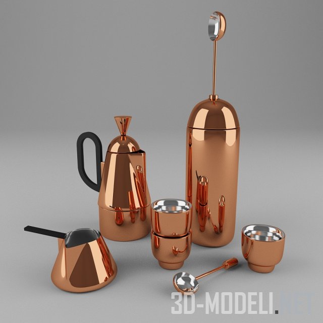 Набор предметов для приготовления кофе, выполненных из отполированной красной меди. Сет содержит кофейник с черной ручкой, турку, кофемолку, ложечку и три чашки без ручек.