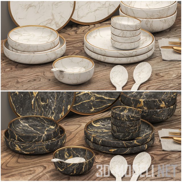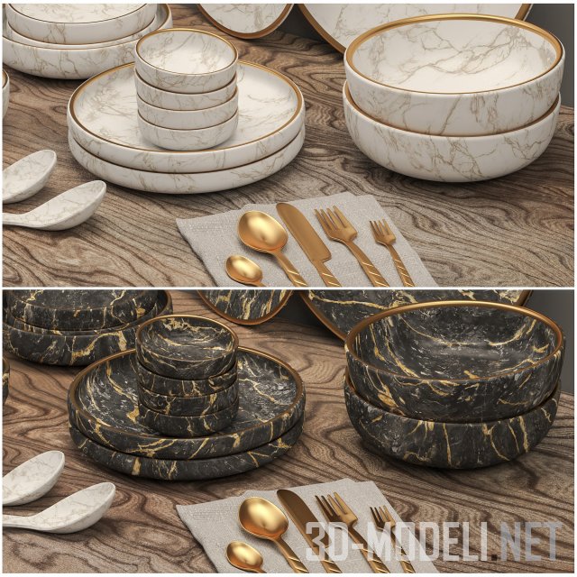 Набор красивой посуды из светлого и темного мрамора. В комплекте столовые приборы, вилки, ложки, ножи цвета розового золота, красиво сочетающиеся с цветом посуды. Этот элегантный комплект станет настоящим украшением подходящей по стилю сервировки.