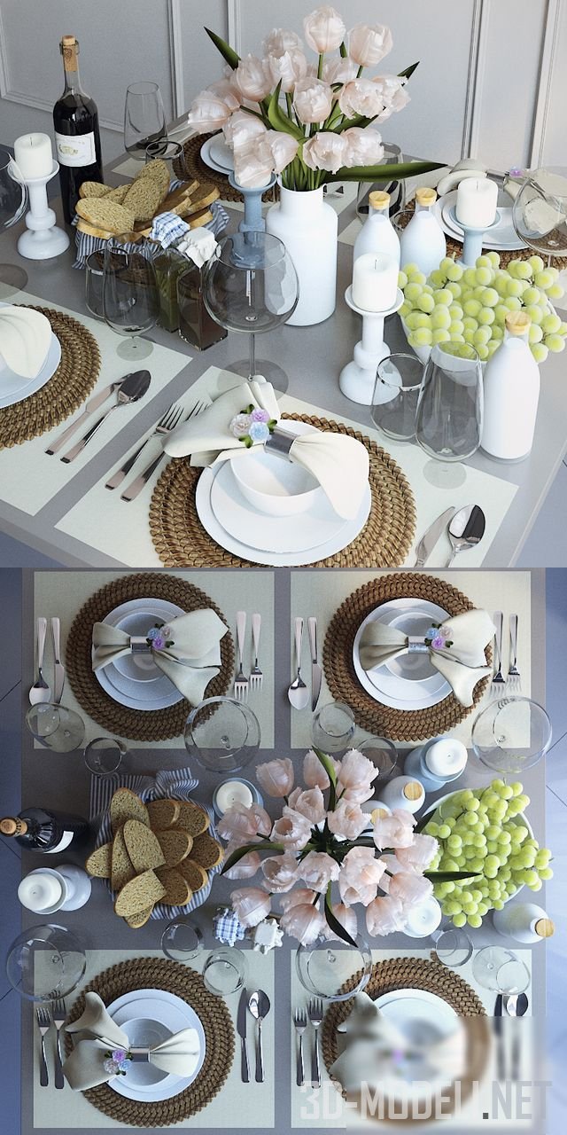 Столовая сервировка в светлых тонах. Центр стола украшает букет с нежными розовыми тюльпанами. Посуда белого цвета, салфетки и свети тоже. Плетеные салфетки вносят контраст. Зеленый виноград в вазе, свежий хлеб и бутылка вина намекают на то, что ужин пройдет хорошо и вкусно.