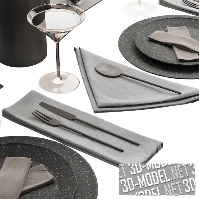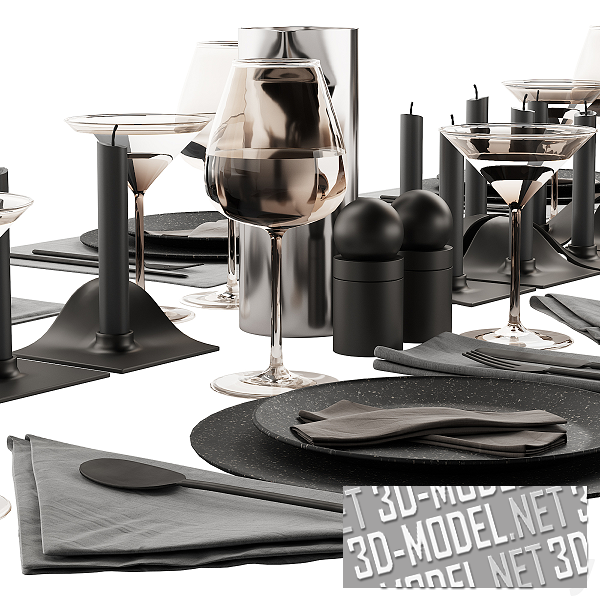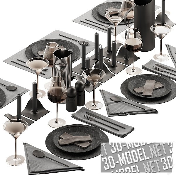 Набор современной посуды и аксессуаров для сервировки стола в кафе или ресторане. Элементы подобраны в темных тонах. В основном в матовом, пепельно-сером цвете. В наборе: круглые тарелки черного цвета с мелкой белой крапинкой; серые тканевые салфетки; стеклянные бокалы для вина и мартини; подсвечники с серыми свечами; вилки, ложки и ножи в минималистичном стиле; Стильный черный графин; ваза из нержавеющего металла в виде чуть замятого цилиндра; черные солонка и перечница.