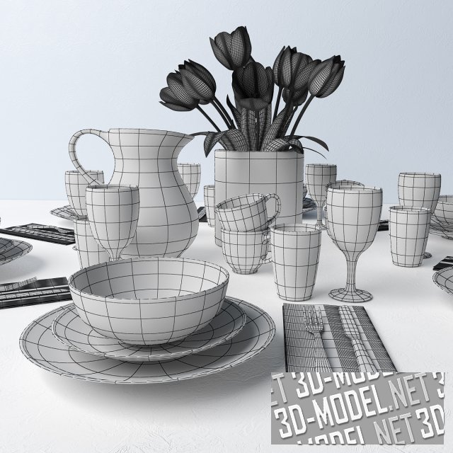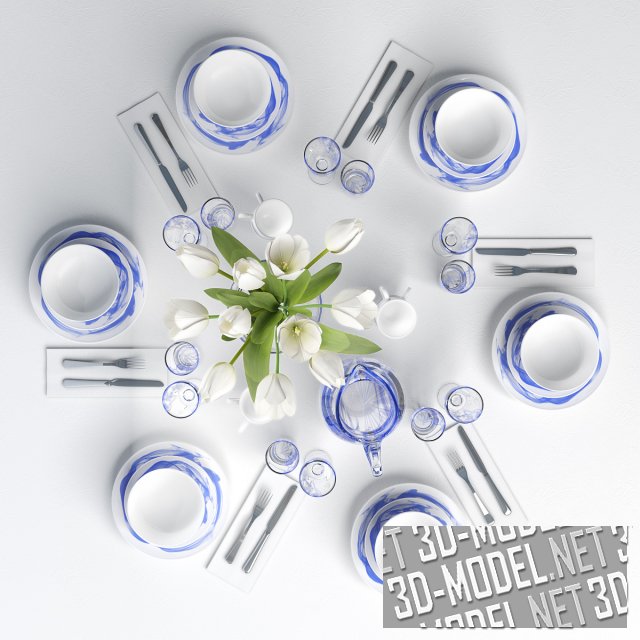 Рассчитанная на шесть персон изысканная сервировка. Вся посуда в светлом, голубом оттенке, нежная роспись придает ей воздушность и легкость. Ваза с букетом белых тюльпанов смотрится очень к месту.