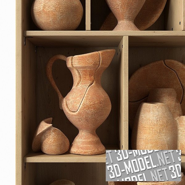 Деревянный стеллаж с полками и ячейками разного размера. На полках - археологические находки античного периода: глиняные амфоры, кувшины, горшки, вазы. В некоторых экземплярах не хватает фрагментов. Некоторые с трещинами.