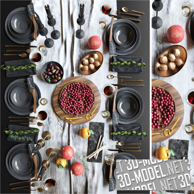Эффектная сервировка современного стола, с черными тарелками и подсвечниками со свечами. Черная посуда отлично сочетается с яркими фруктами и зелеными ветками. Тарелка с орехами и столовые приборы вносят в набор праздничную нотку.