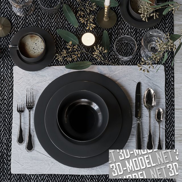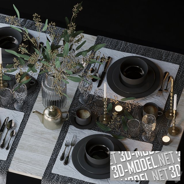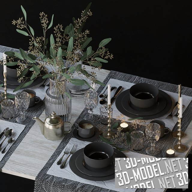 Красивая элегантная сервировка стола в в темных тонах. На больших полотняных салфетках с рисунком в серую и белую елочку лежат четыре белые структурные салфетки, на которых размещены черные тарелки и мельхиоровые столовые приборы нож, ложки, вилки. Возле каждого прибора стоят хрустальные стакан и бокал, а также черные чайные пары. В центре стола возле хрустальной вазы с ветками эвкалипта стоят свечи в высоких витых подсвечниках золотистого цвета и маленький золотистый чайник.