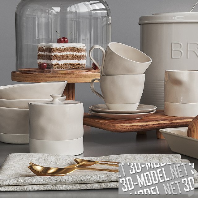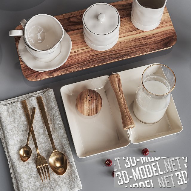 Эстетичный кухонный сет для завтрака. Его основу составляет фарфоровая посуда белого цвета с ассиметричным дизайном: чашки, блюдца, молочник, сахарница и три мисочки. На белом металлическом подносе с ручкой круглая солонка из дерева акации и высокий стеклянный кувшин с молоком. На льняной жаккардовой салфетке лежат золотые столовые приборы. Деревянное блюдо на ножке, где под высоким стеклянным колпаком лежит аппетитный кусок кремового торта, деревянная сервировочная доска  и белый металлический лакированный контейнер для хлеба довершают инсталляцию.