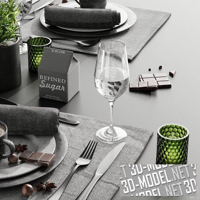 Элегантная сервировка в темных тонах, преобладает черный и серый благородные оттенки. Теплоту добавляет кофе и шоколад, а элементы зеленого цвета вносят приятный контраст.