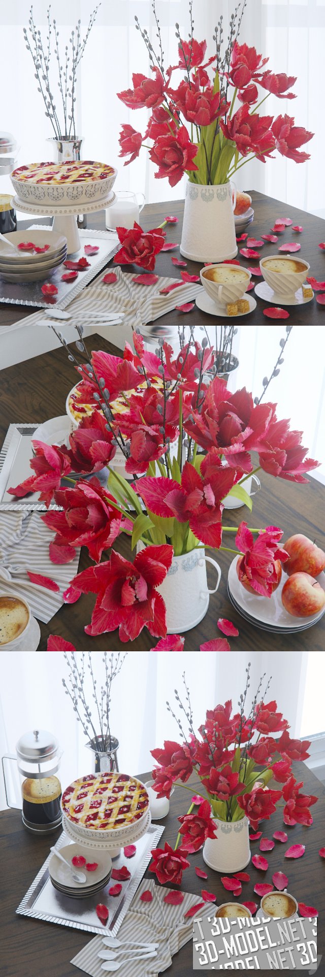 Красивый набор посуды белого цвета с легким голубым узором: вазы, тарелки, чашки с кофе. Мельхиоровый поднос, мельхиоровая ваза с ветками вербы, красные яблоки на тарелке, красные тюльпаны в белой вазе и лепестки на легкой бело-голубой салфетке придают этой инсталляции дополнительный шарм и весеннее очарование.