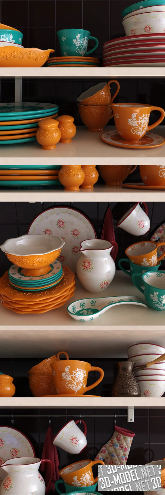Посуда Elan Gallery из нескольких коллекций (белого, бордового, оранжевого и бирюзового цветов) на белых полках и столешнице. Кроме посуды в сцене: медная турка с рельефом на поверхности и точеной деревянной ручкой, бордовое полотенце и текстильная рукавица для горячего на серебристом рейлинге с крючками. Тарелки, чашки, салатницы, кувшин, масленка, пиалы и керамическая подставка для ложки представлены из следующих коллекций: "Solar Flower," "Flower Turquoise", "Flower orange field", "Orange pattern."