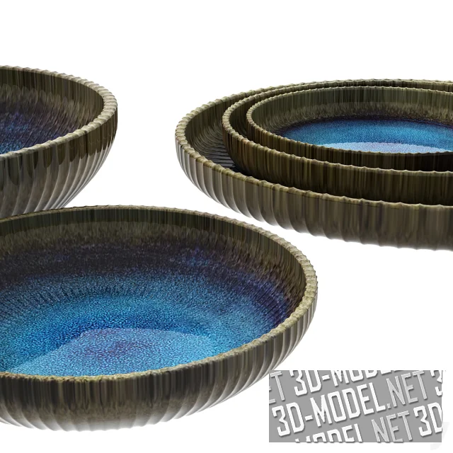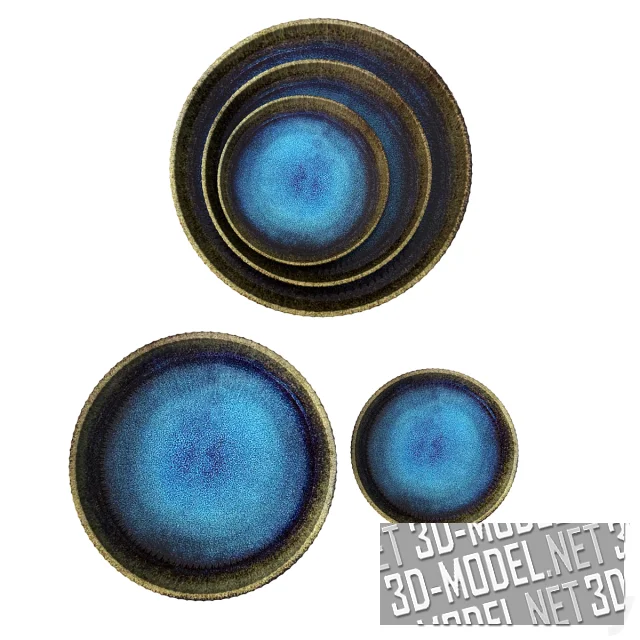 Набор посуды из керамики для наполнения кухни. Тарелки представлены в различных размерах: диаметр 12 см х высота 2,3 см; диаметр 24 см х высота 2,3 см; диаметр 36 см х высота 2,3 см; диаметр 12 см х высота 4,5 см; диаметр 21,5 см х высота 4,5 см.