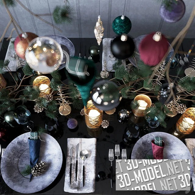 Набор для праздничного декора и сервировки в изысканных темных тонах – идеальный вариант для зимнего торжества или новогоднего ужина. На столе композиция из еловых ветвей, шаров и шишек, дополненная металлическими подсвечниками с узором и миниатюрными елками. Серебристо-черная палитра акцентируется золотом и глубокими оттенками бордо, зелени и сапфира, создавая атмосферу уюта и утонченности.