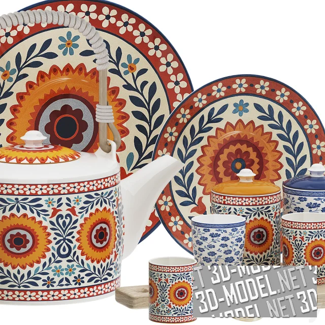 Пестрый набор декоративно оформленной посуды в современной интерпретации народных техник и стилей (Modern Folk). В сете собраны деревянная разделочная доска; белый комплект с чайником, двумя круглыми тарелками, стаканом и емкостями для сыпучих продуктов, расписанные растительными мотивами в оранжево-терракотово-синих тонах; комплект (стакан и пара емкостей для сыпучих продуктов) с синими цветами на белом фоне. В росписи посуды просматриваются турецкие, восточноевропейские и мексиканские мотивы.
