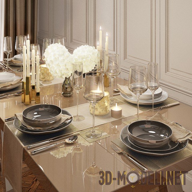 3D-модель прекрасной сервировки с посудой от Kelly Hoppen. Изящная простота в дизайне, нейтральная цветовая гамма, очаровательный флер ручной работы делает набор универсальным вариантом сервировки. В сцене присутствует стол, тарелки десертные и сервировочные из Zen Collection, миски, бокалы для шампанского и фужеры для вина Capri, столовые приборы Cutipol piccadilly, металлические подставки Ando, серо-коричневые льняные салфетки и свечи. Модель выполнена невероятно качественно, со вкусом и вниманием к деталям.