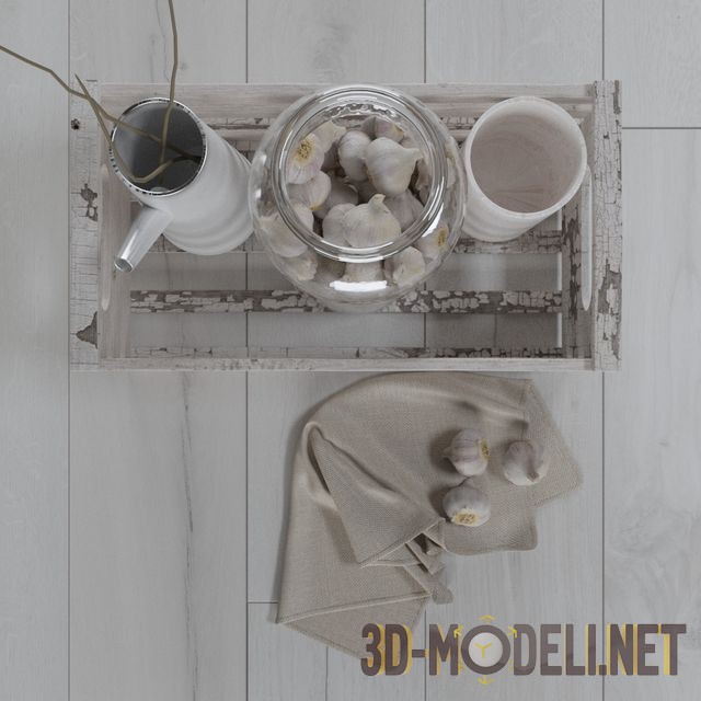Чеснок в вариантах. Набор для кухни в этно–стиле. Прекрасно подойдёт в интерьер в стиле прованс или другой, с налётом ретро. В ящике, сбитом из деревянных реек, с облупившейся белой краской, стоит стеклянная банка с сухими чесночными головками, высокий металлический чайник и белая с кракелюром простая ваза. Рядом с ящиком, на тряпице из льняного полотна, ещё несколько головок чеснока.