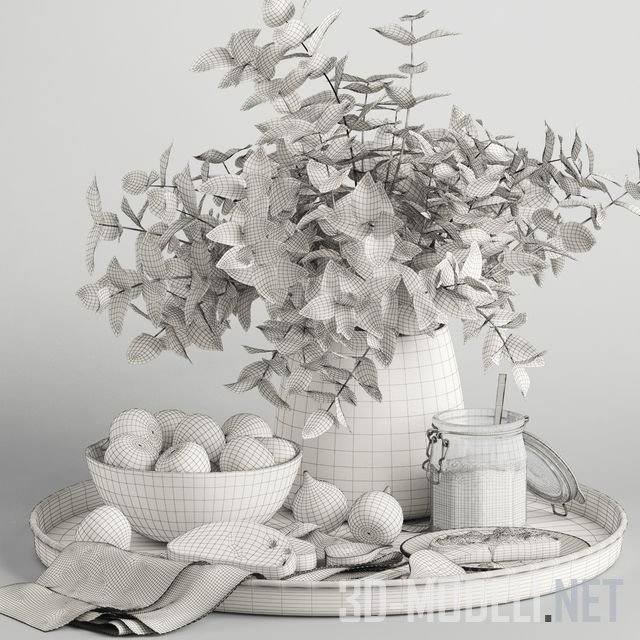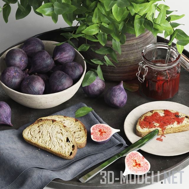 Аппетитный, насыщенный по цвету сет для интерьера кухни: на круглом темном подносе лежит салфетка с ножом, стоит открытая банка варенья и ломтики батона, белая миска с инжиром и ярко-зеленый букет, отлично дополняющий композицию.