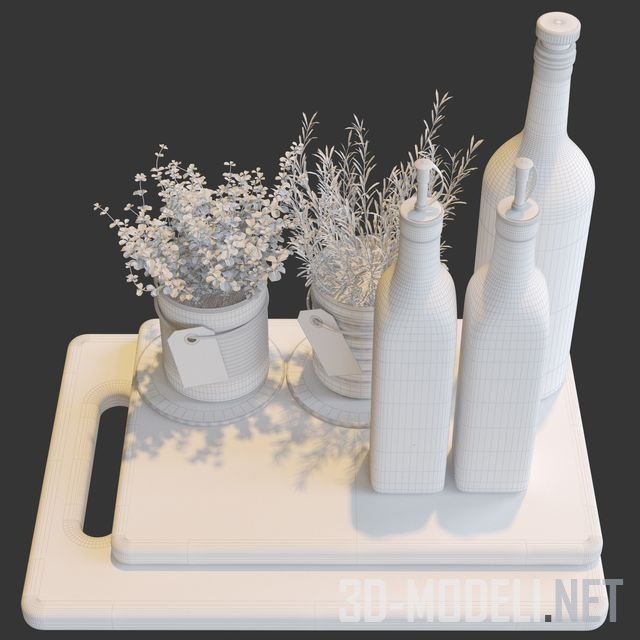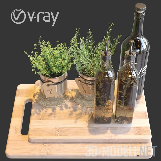 Отличный набор для придания интерьеру кухни еще большего реализма: травы в горшочке, две подставки, три бутылки оливкового масла и две разделочные доски.