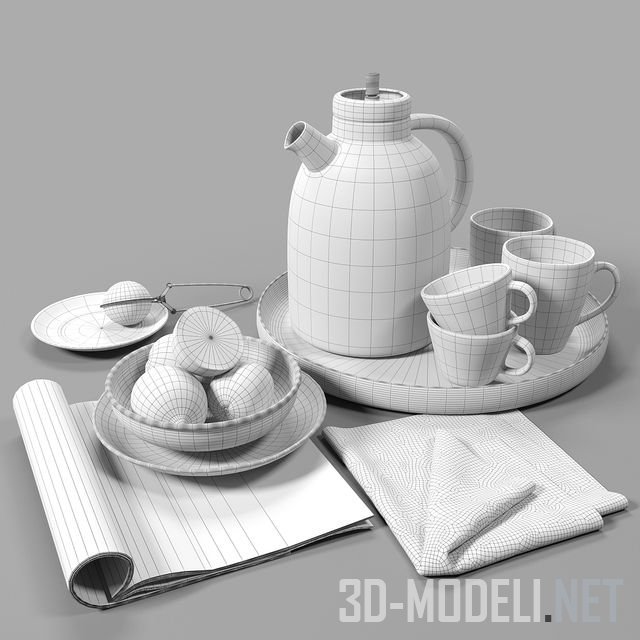 Эстетичный набор продуктов и аксессуаров для интерьера в сдержанном, Скандинавском стиле. Содержит поднос с чайником и чашками, полотенце, вазу с лимонами, журнал. Реалистичная и подробная трехмерная модель с текстурами.