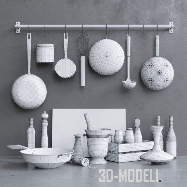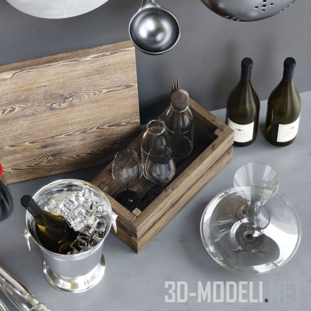 Набор кухонной утвари и аксессуаров Baltimora, которые отлично сочетаются между собой, образуя гармоничный и функциональный комплект. Файл содержит разделочные доски, венчик, половник, шумовку, миски и сковороду, масло, вино, бокалы.