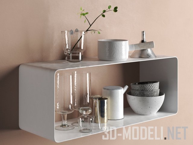 Набор для интерьера кухни в комплекте с персиковой стеной и столешницей. На столешнице предметы посуды и аксессуары. Простая белая открытая полка также уставлена предметами, характерными для кухонной зоны.