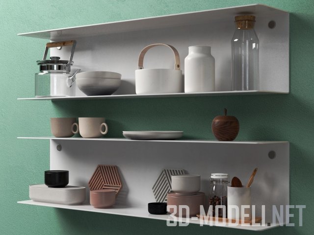 Эстетичный комплект для наполнения пространства кухни. В наборе кухонная утварь (разделочная доска, ложки и пр.), посуда, предметы декора. Выполненная на высоком уровне, 3D модель станет отличным выбором для различных проектов.