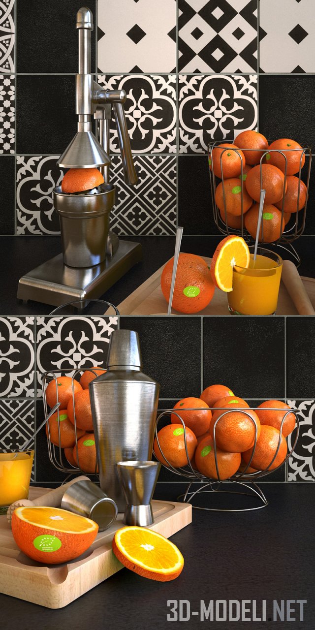 Яркий жизнерадостный набор с шейкером из нержавеющей стали Louis Tellier объемом 500 мл, оранжевыми апельсинами в металлических сетках, апельсинами на деревянной доске и стеклянными стаканами, с налитым в них ярко-желтым апельсиновым соком и кружочком апельсина на краю одного из них.