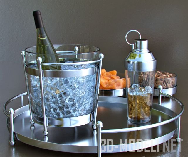 Декоративный набор для алкоголя от Pottery Barn, аксессуары выполнены из стали и стекла. Содержит поднос Ava Tray, Ava Cocktail Shaker, Ava Ice Bucket и Ava Double Snack Bowl Stack. Миндаль и курага в вазочках идеально дополняют напитки.