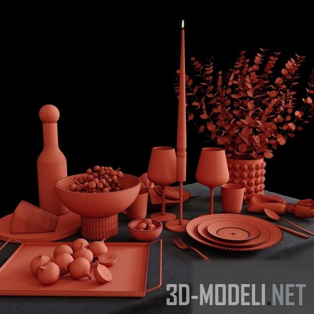 Реалистичный набор предметов для интерьера кухни, гостиной или столовой. Содержит круглый поднос, кольца для салфеток, рельефный горшок для цветов, фарфоровую тарелку с рисунком, столовые приборы, стильный подсвечник, графин с пробкой, маленькую мраморную салатницу и черную фарфоровую тарелку, бокалы из стекла цвета серый антрацит. Фрукты (инжир, виноград) и сыр оживляют композицию, делая ее еще более достоверной.