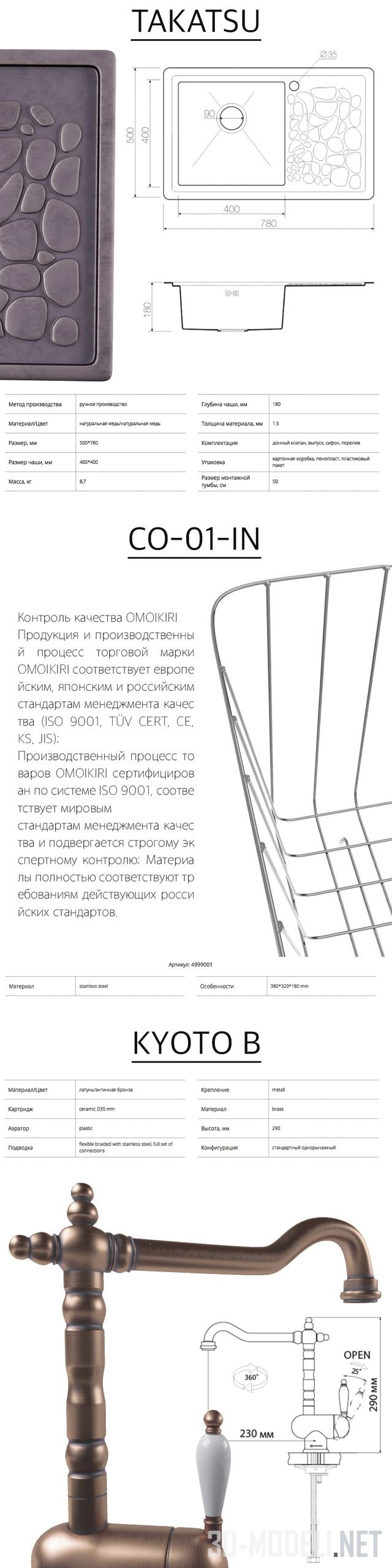 Набор для кухни от компании Omoikiri. В основе содержит мойку TAKATSU (артикул: OTA-78-1-CO). Материал и цвет мойки: натуральная медь. Размер 500 х 780 мм, размер чаши 400 х 400 мм, глубина чаши 180 мм. Мойку дополняет смеситель KYOTO B (артикул: oKY-AC-35). материал и цвет: латунь/античная медь. Высота 290 мм. В мойке предусмотрена корзина из нержавеющей стали CO-01-IN (артикул: 4999001). Размер корзины: 380 х 320 х 180 мм.